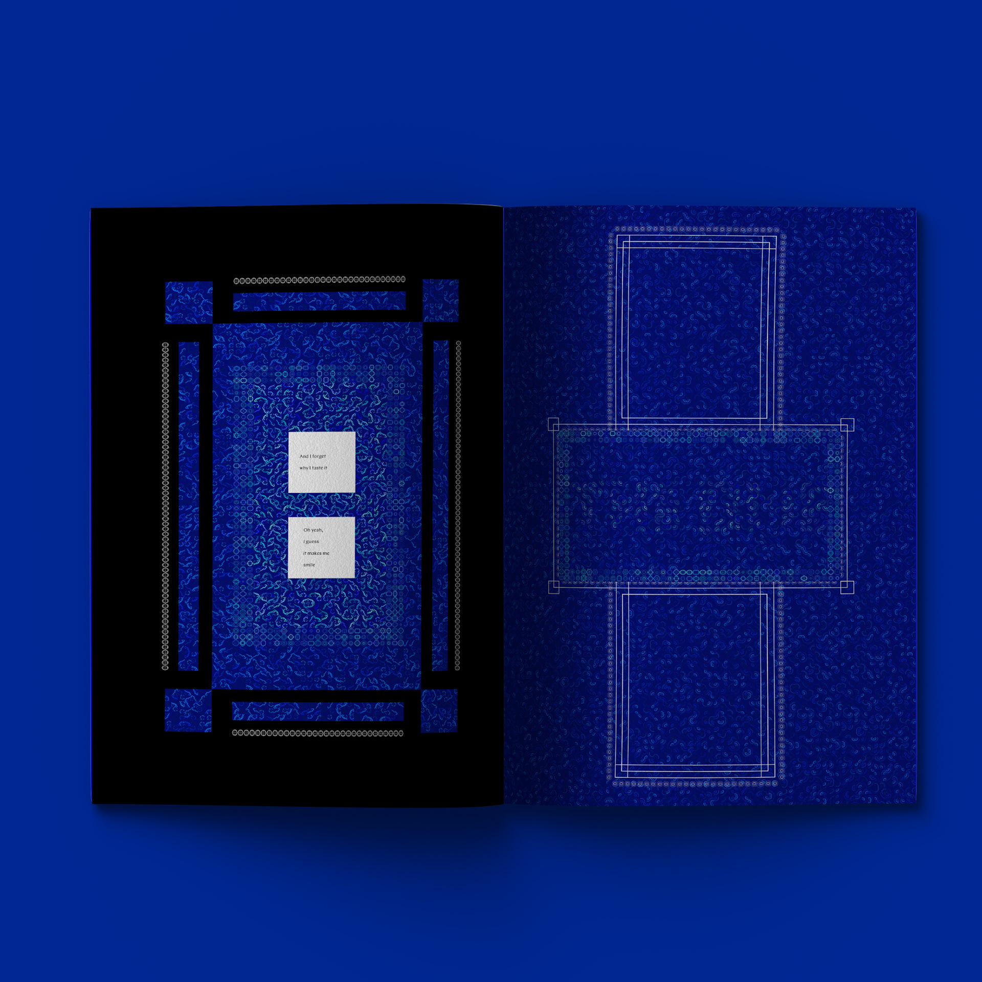Throughout the project there is text. Sometimes the text are part of the lyrics of each song, and in some of them I did a bit of an intervention. Despite the visible text, some hidden words can be found in between the patterns.
